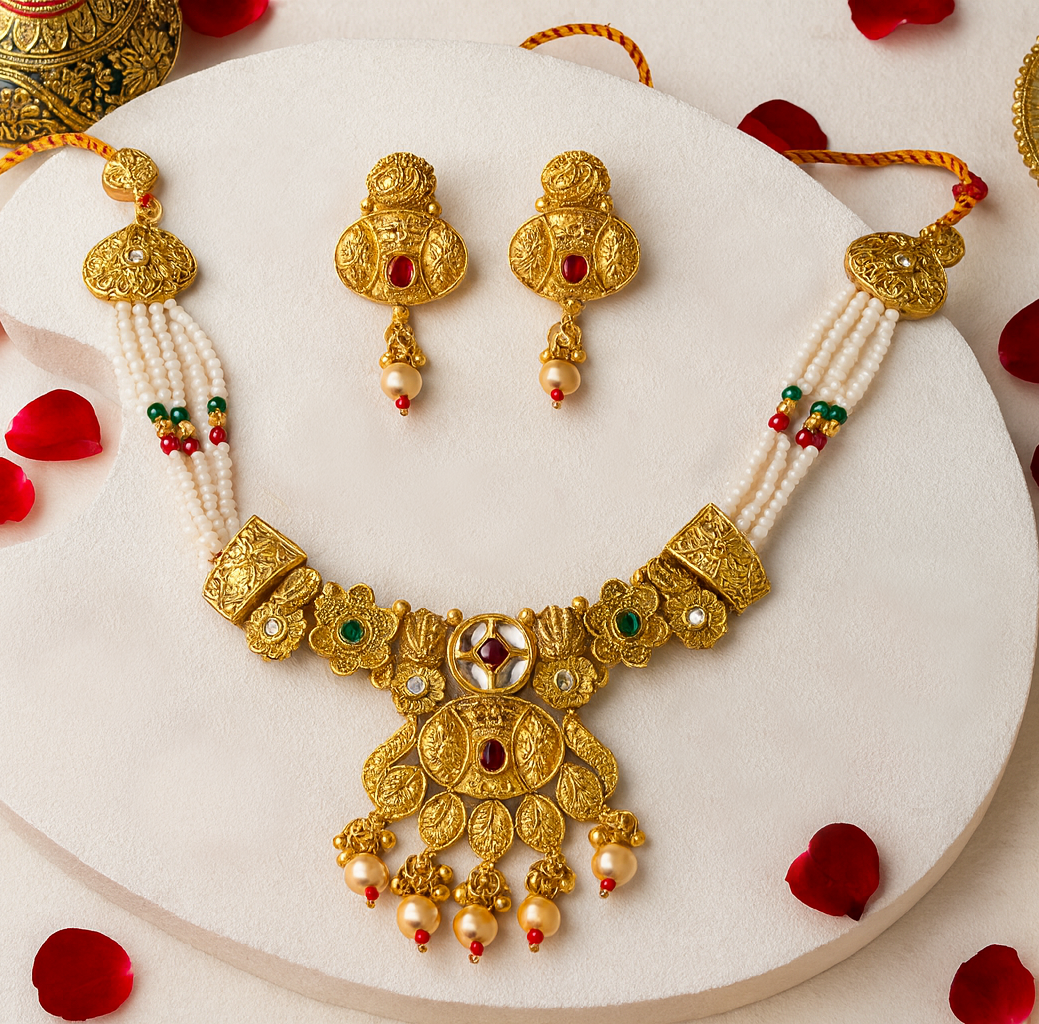 This exquisite piece features beautifully carved motifs, traditional floral elements, sparkling stones, and premium pearl droplets—creating a look that is rich, divine, and truly majestic.
