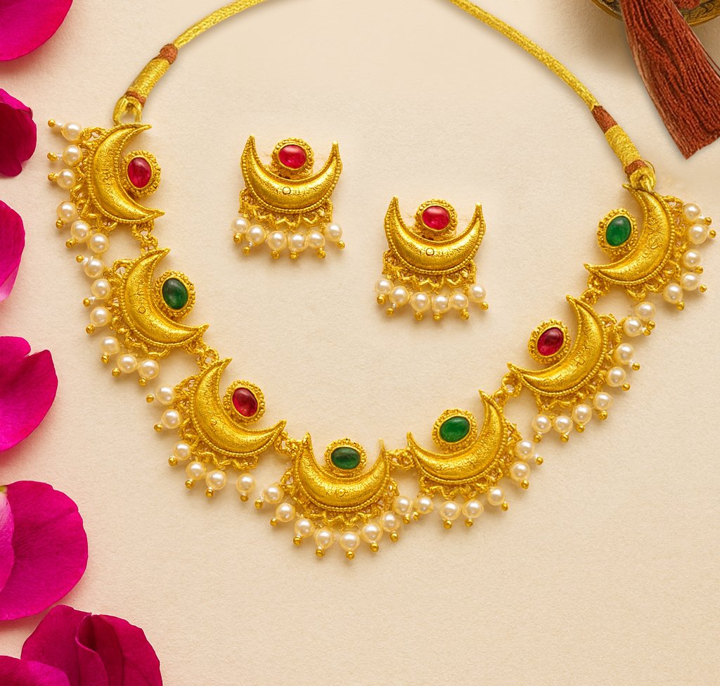 Inspired by the timeless beauty of crescent moons, the Chandrika Pearl Crescent Necklace Set reflects royal elegance and traditional charm. Crafted in rich gold polish, this necklace features delicately detailed crescent motifs adorned with ruby-red and emerald-green stones, gracefully finished with clusters of soft pearls. The matching earrings complete the look, making it a perfect statement set for festive and wedding occasions.
