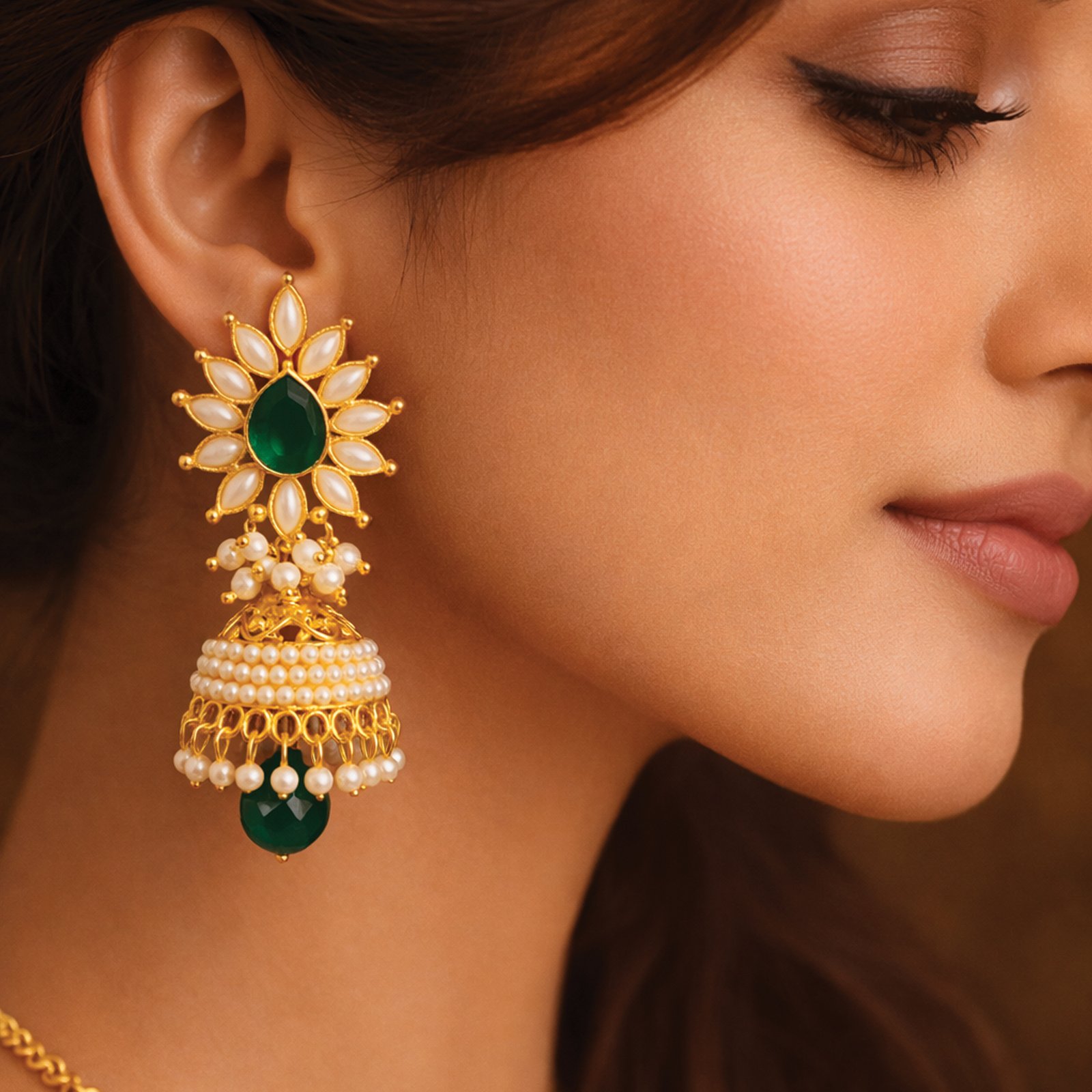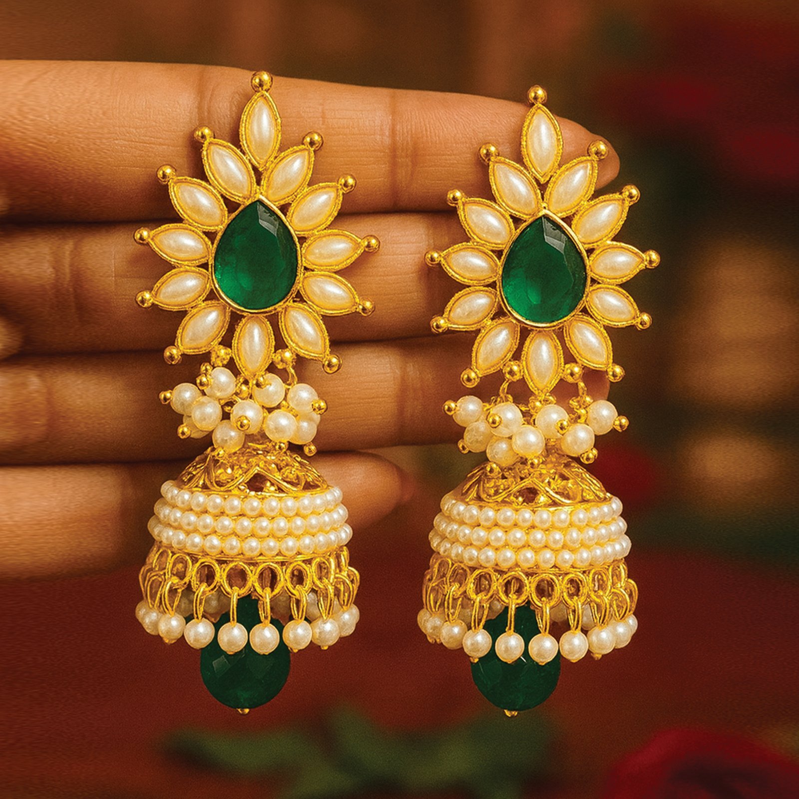 Elevate your ethnic look with these exquisitely handcrafted jhumkis, designed to make every moment special. Featuring a radiant floral motif with a striking emerald-green stone at the center, these earrings are beautifully adorned with pearl detailing and traditional gold polish. The graceful pearl-studded dome adds a regal charm, making them a must-have for festive and wedding wear.