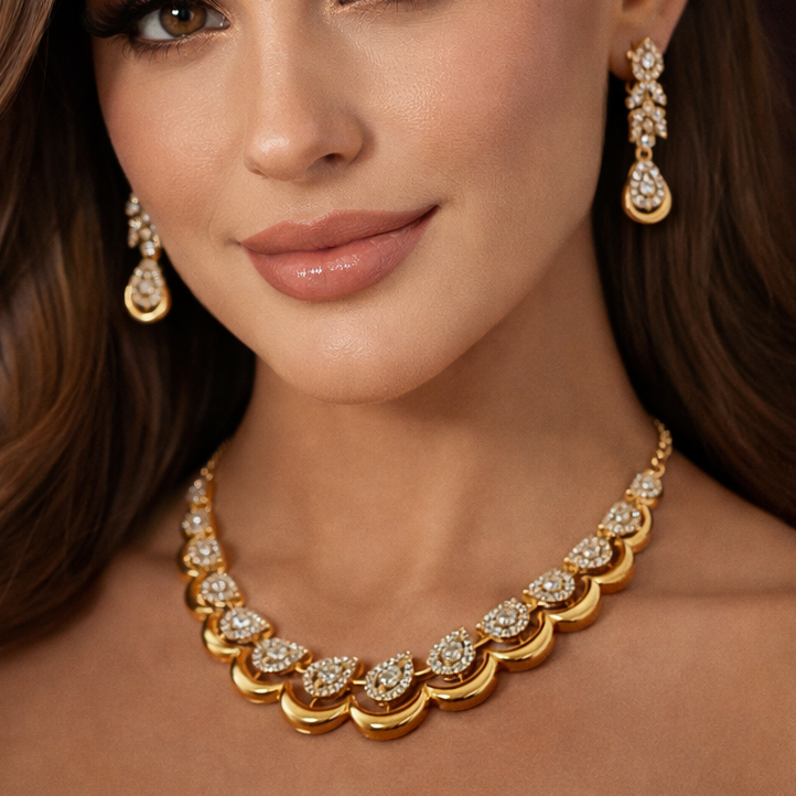 - Description: This exquisite jewelry set features a short, gold-plated necklace and matching drop earrings, designed with intricate, overlapping leaf or paisley motifs. Each motif is studded with shimmering white stones, likely American Diamonds (AD) or cubic zirconia (CZ), giving it a luxurious and elegant appearance. The set has a rich, gold-look finish and is secured with an adjustable chain or drawstring for a comfortable fit.