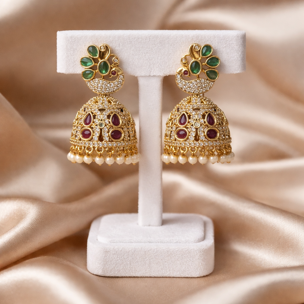Elevate your ethnic look with these stunning royal peacock jhumki earrings, beautifully crafted with intricate detailing and rich embellishments. The top features a graceful peacock-inspired design adorned with vibrant green stones, symbolizing beauty and elegance.